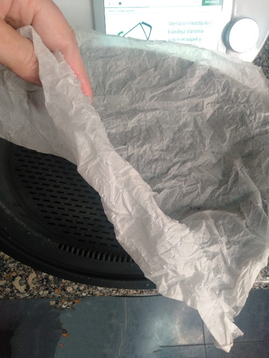 8 ?Retira el Varoma. Retira la bandeja Varoma (recuerda levantar la tapa con cuidado de no recibir el golpe del vapor en la cara) y desliza el papel con la frittata a una bandeja de horno.