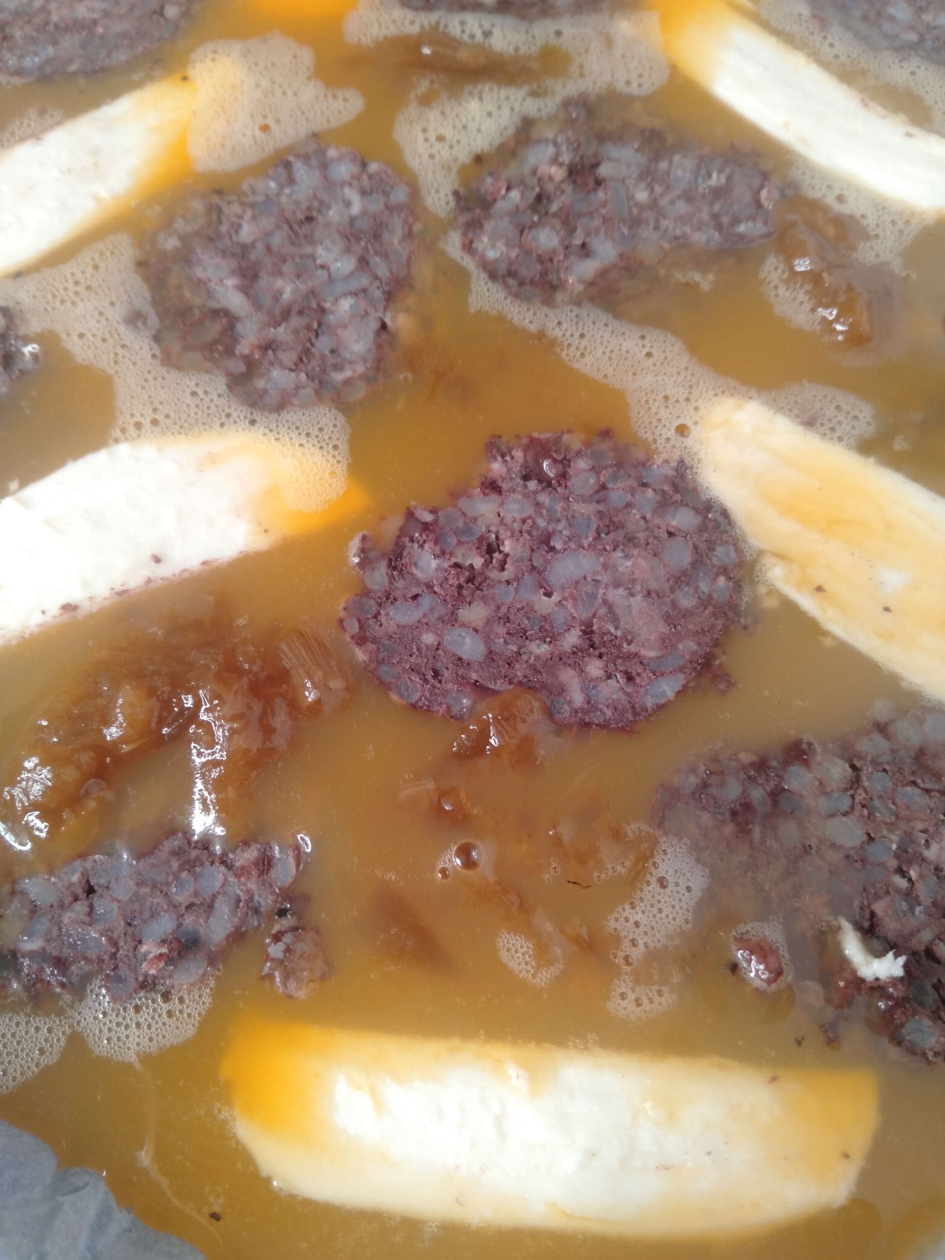 6 ? Echa los 500gr de agua en el vaso y Sitúa el recipiente Varoma con la bandeja en su posición. Distribuye las rodajas de morcilla, la mozzarella fresca sobre el huevo y unas cucharaditas de cebolla caramelizada.