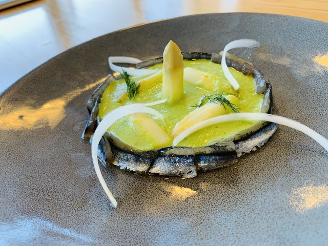 Espárragos blancos frescos con gazpacho de guisantes