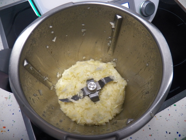 Lo primero que tenemos que hacer es poner en el vaso el aceite y la cebolla en cuartos. Troceamos 3 segundos velocidad 5