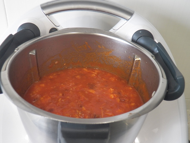 Incorporamos el tomate frito casero y sofreimos 7 minutos, temperatura varoma, velocidad 1.