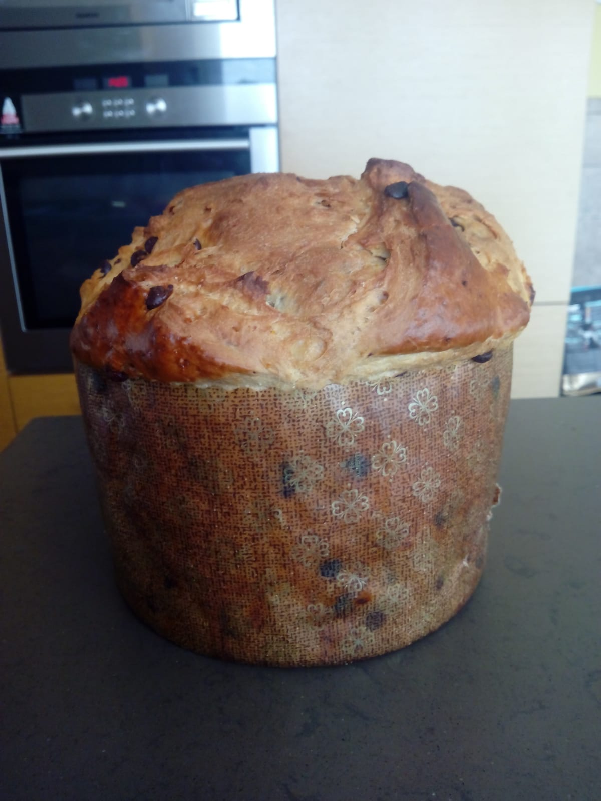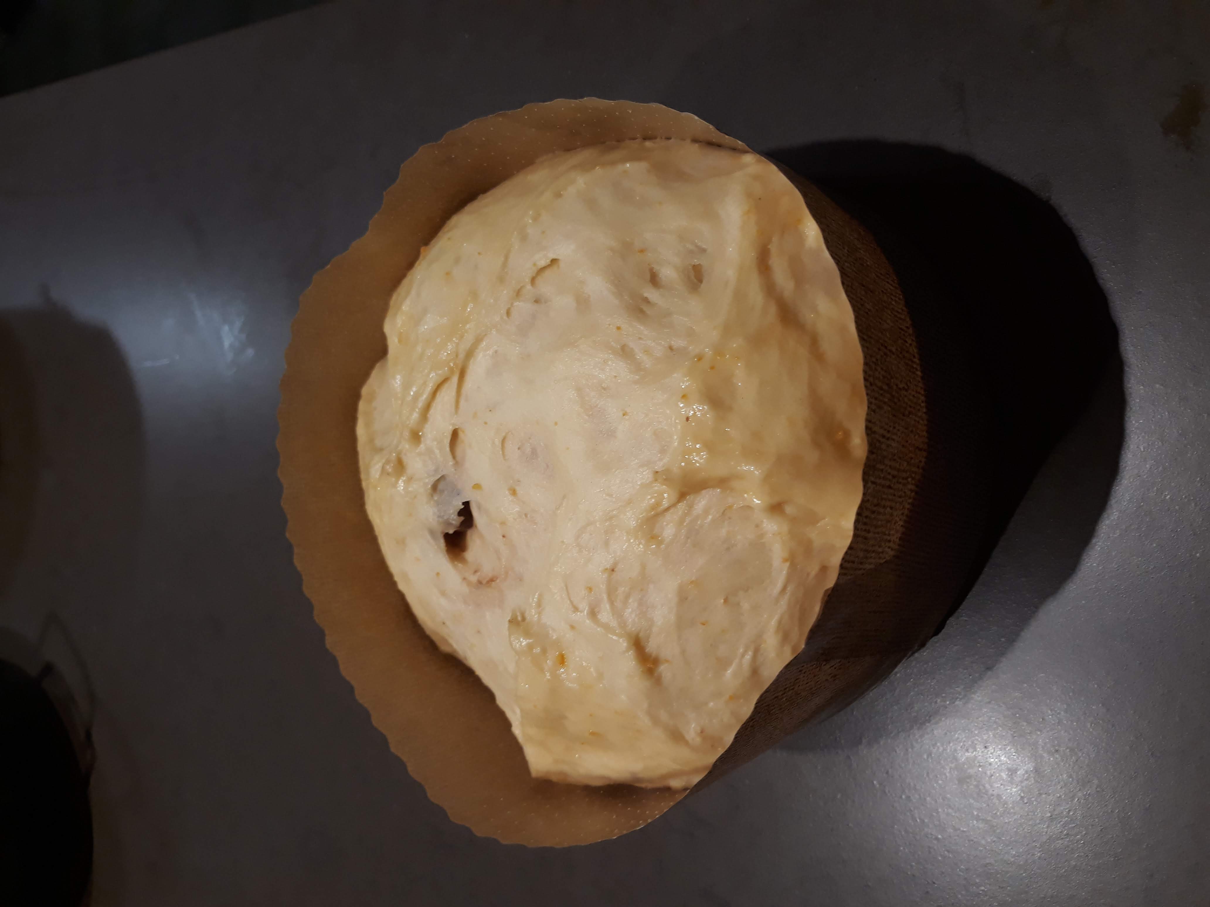 Le damos forma de bola y lo introducimos en el molde de papel que hay especial para panettones. Lo pintamos con huevo batido y le hacemos una cruz con un cuchillo en la parte superior. Y lo metemos en el horno o microondas para que repose y vuelva a doblar su tamaño. Esto suele ser entre una hora y hora y media.
