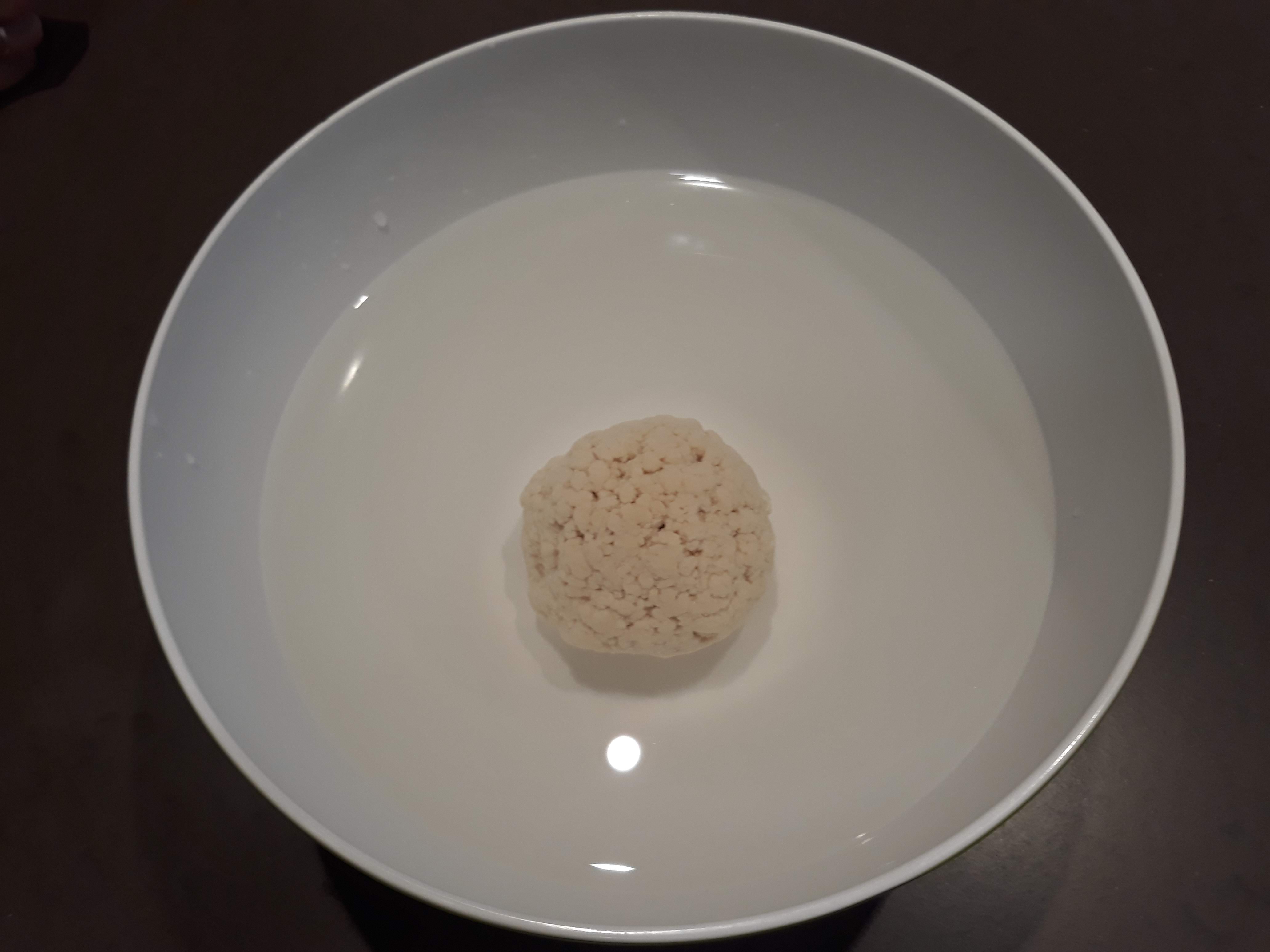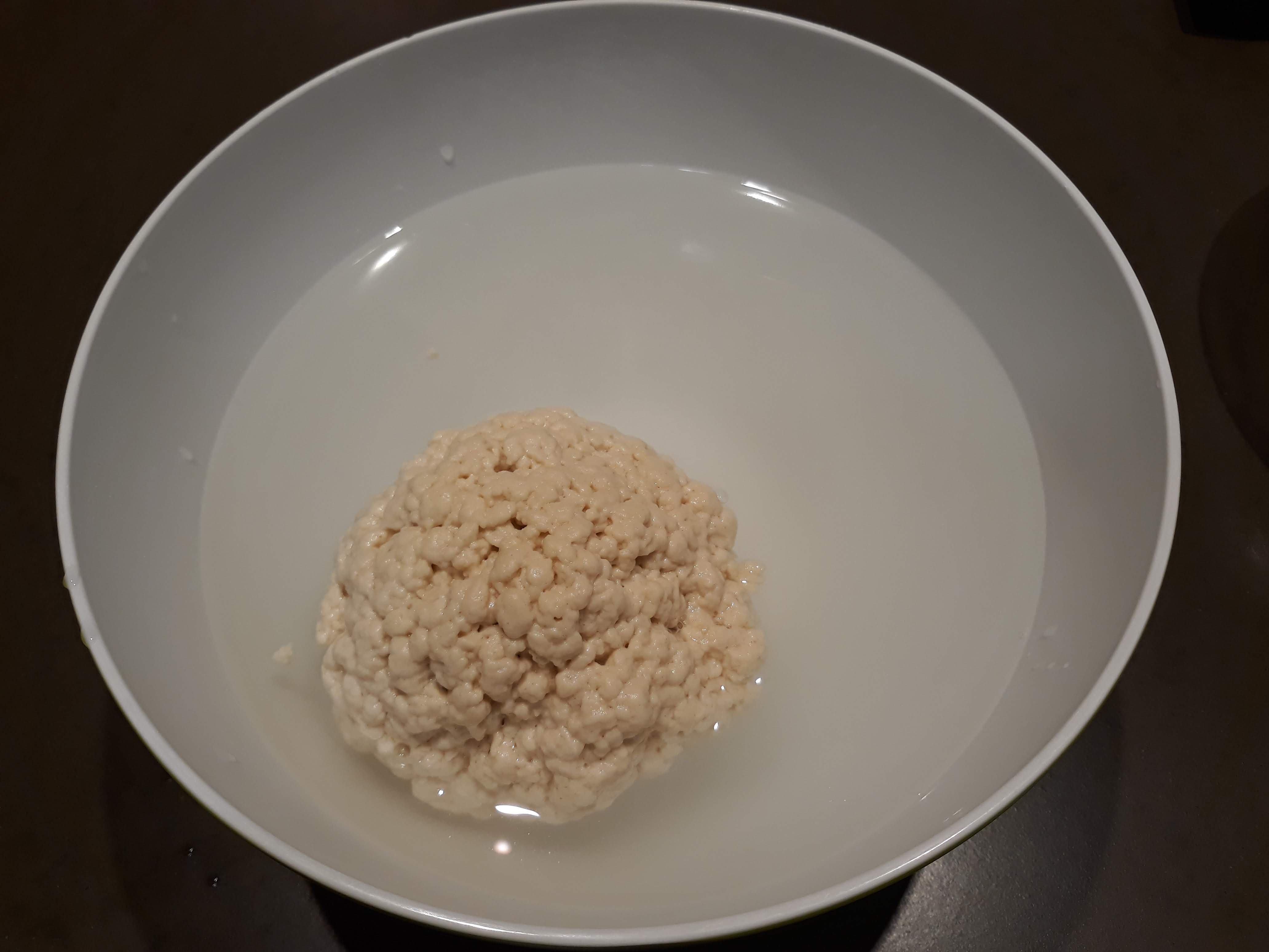 Retiramos la masa del vaso y formamos con ella una bola no muy prensada. La introducimos en un bol, la cubrimos con agua templada y esperamos a que duplique su tamaño y flote. En ese momento es cuando estará lista para el siguiente paso.
