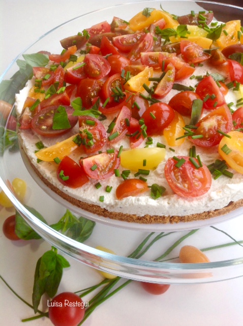 Es un aperitivo para sorprender, una tarta de quesos y se puede hacer de vispera. Solo poner los cherrys al final con cebollino picado y hojas de albahaca cortada con la mano, no con tijera que pierde el aroma.