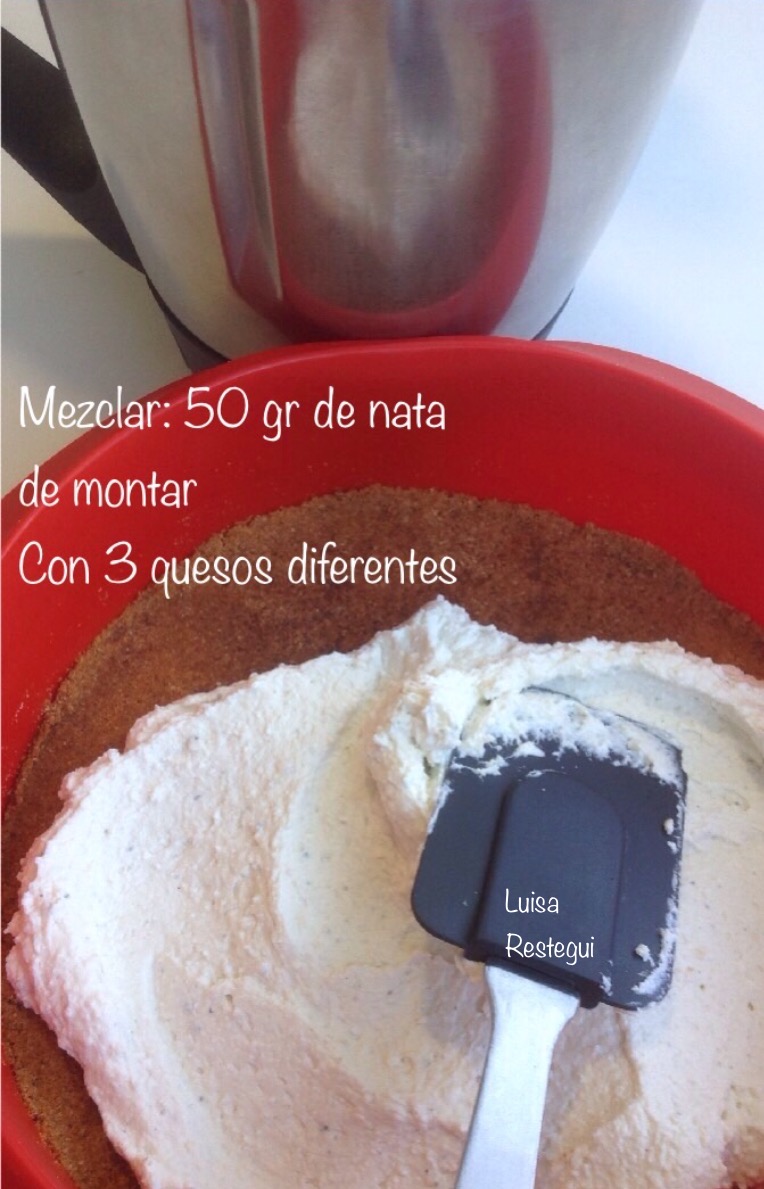 5.- Vierta en el molde reservado sobre las galletas trituradas y, con la ayuda de la espátula, extienda la mezcla de quesos para cubrir toda la superficie. Reserve la tarta de 3 quesos en el frigorífico.