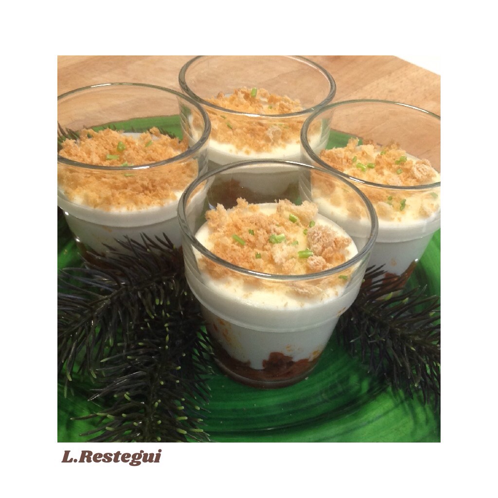 Se sirve en vaso con tres capas. En el fondo ponemos la carne –morcillo, mezclado con salsa de tomate para que esté más jugoso. Encima una besamel de cobertura y por último en vez de pan rallado, “panko “con cebollino picado.
