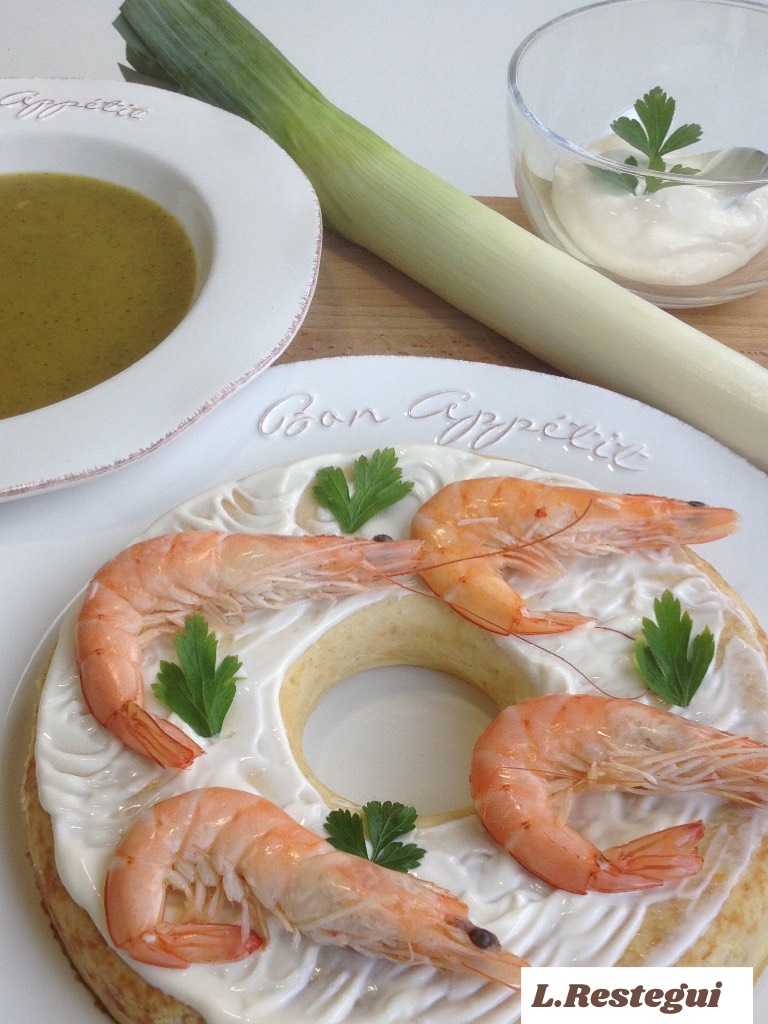 Pastel de puerros y langostinos con crema de verduras : Menú completo