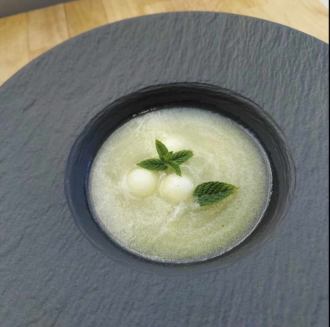 -Si quieres hacer una sopa tipo de emulsión, batir el melón junto con el aceite, no poner el zumo. Cuanto más aceite nos va a quedar más emulsionado. Poner unas hojas de albahaca a triturar, un poco de sal, parece una sopa cremosa.
