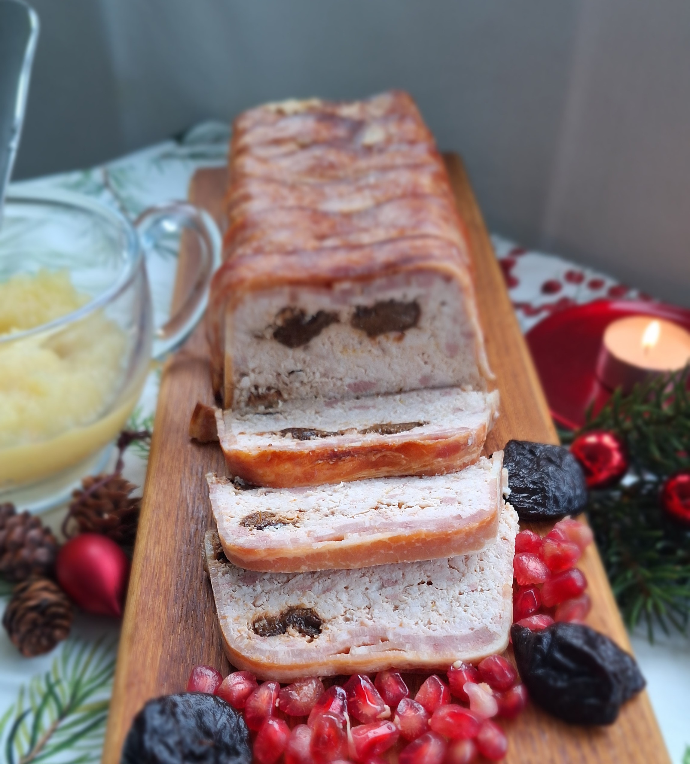 Ponga en el vaso la carne picada de pavo, el foie, la sal, la pimienta, la nuez moscada, los huevos y las ciruelas pasas y mezcle 30 seg/giro inverso/vel 3. Vierta la mezcla en el molde preparado, apretando bien con la espátula, y cubra con las lonchas de beicon. Tape el molde con film transparente, colóquelo dentro del recipiente Varoma, tape y reserve. Lave un poco el vaso.
