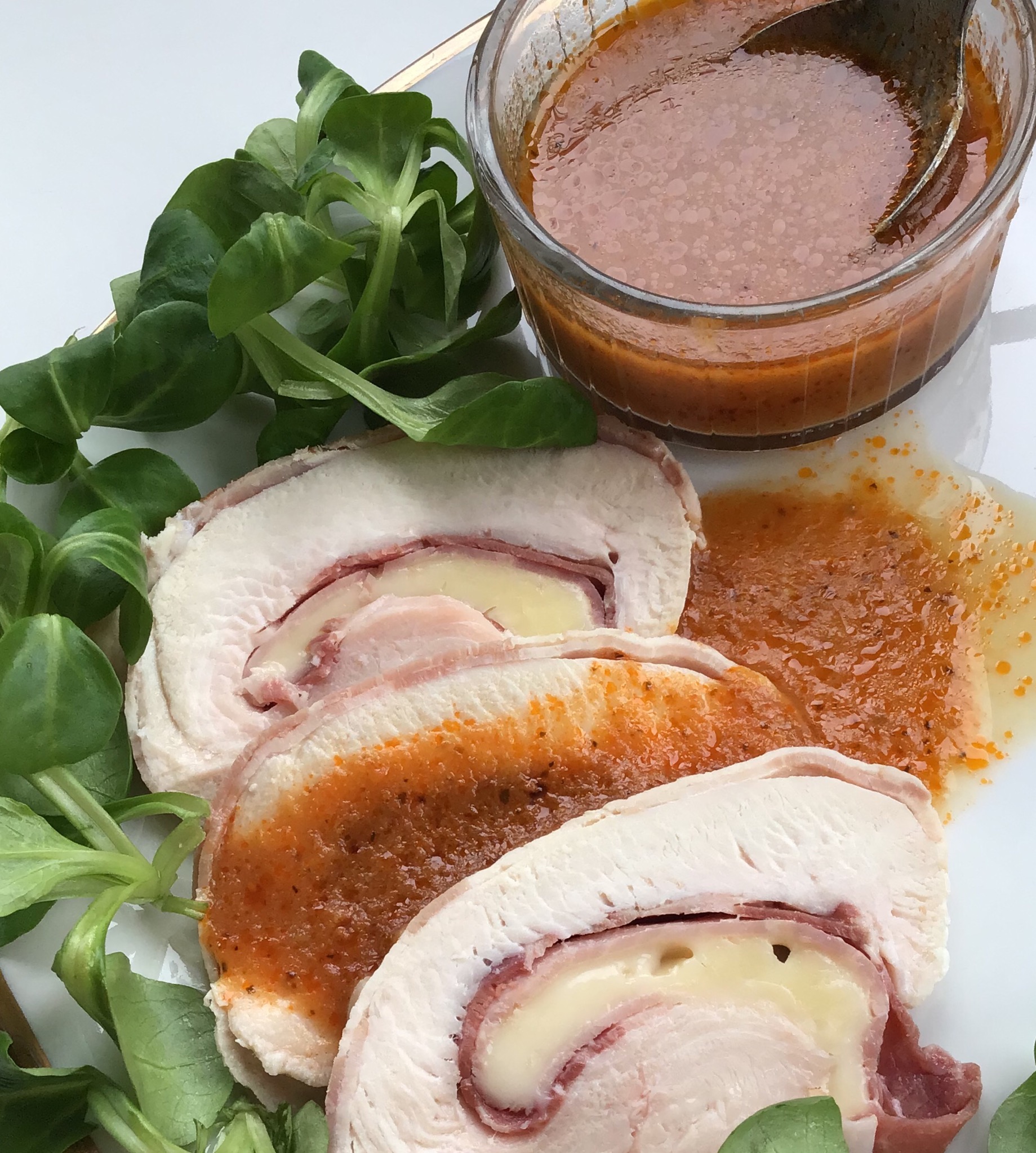 3.- Una vez templado, corte en rodajas y servir con la salsa.