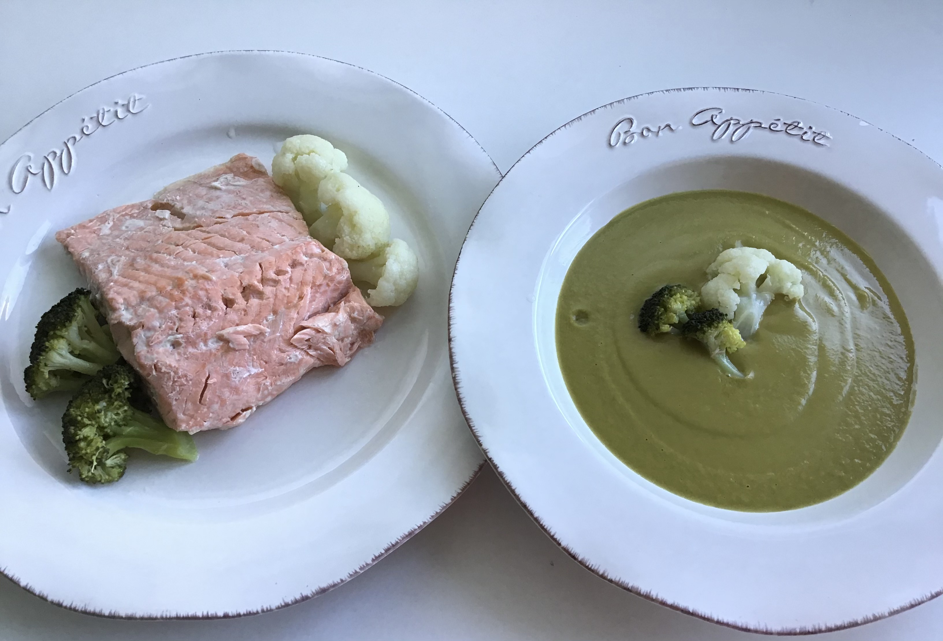Menú completo. Crema de aprovechamiento con salmón, coliflor y brócoli al vapor