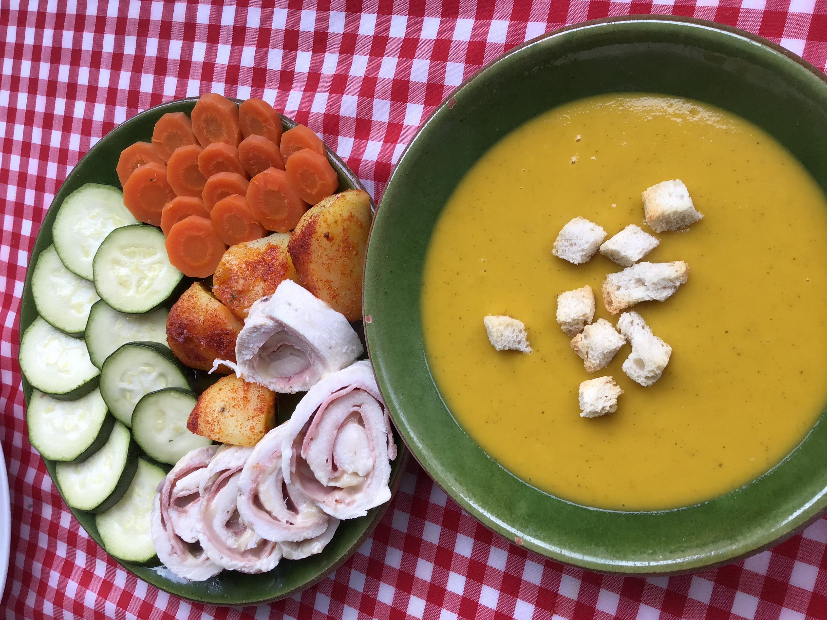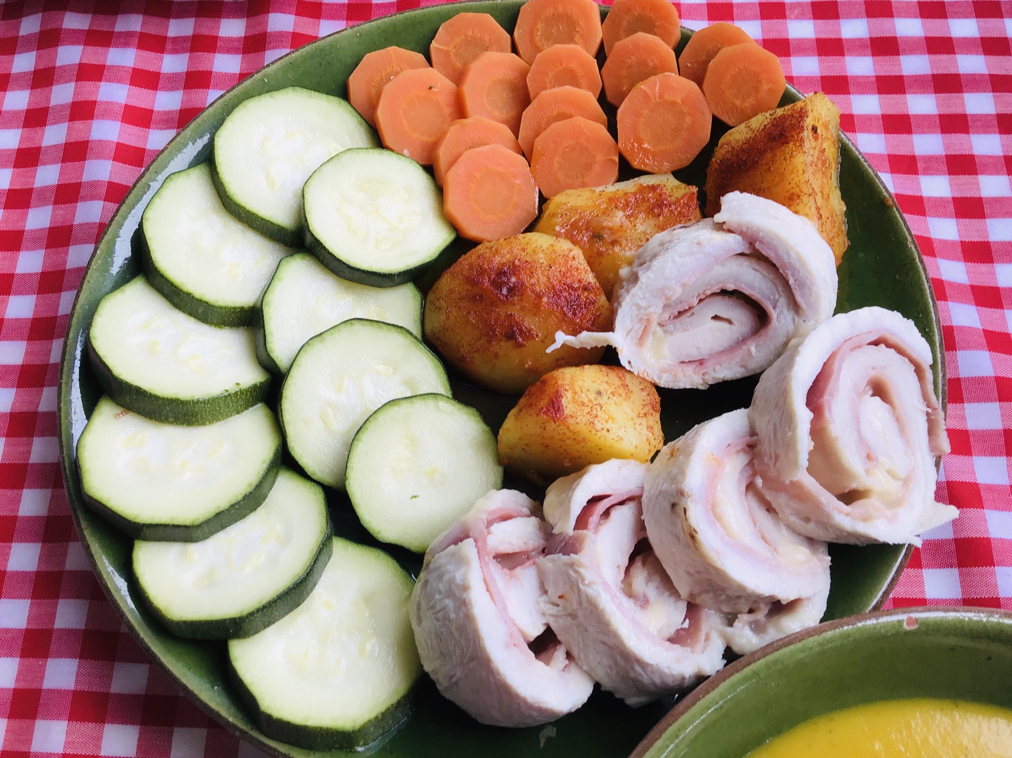 Menú completo: crema de verduras, rollo de pollo, patatas y verdura al vapor