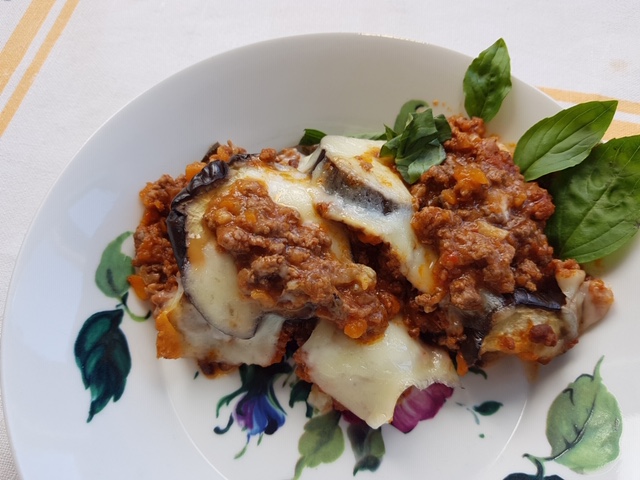 La voy a hacer "A mi manera" y como más me gusta: capa de berenjena, salsa boloñesa, capa de queso parmesano rallado, capa de queso mozzarella, orégano y albahaca. Y termino con capa de berenjenas y salsa de tomate, parmesano, orégano y albahaca.