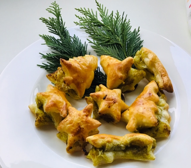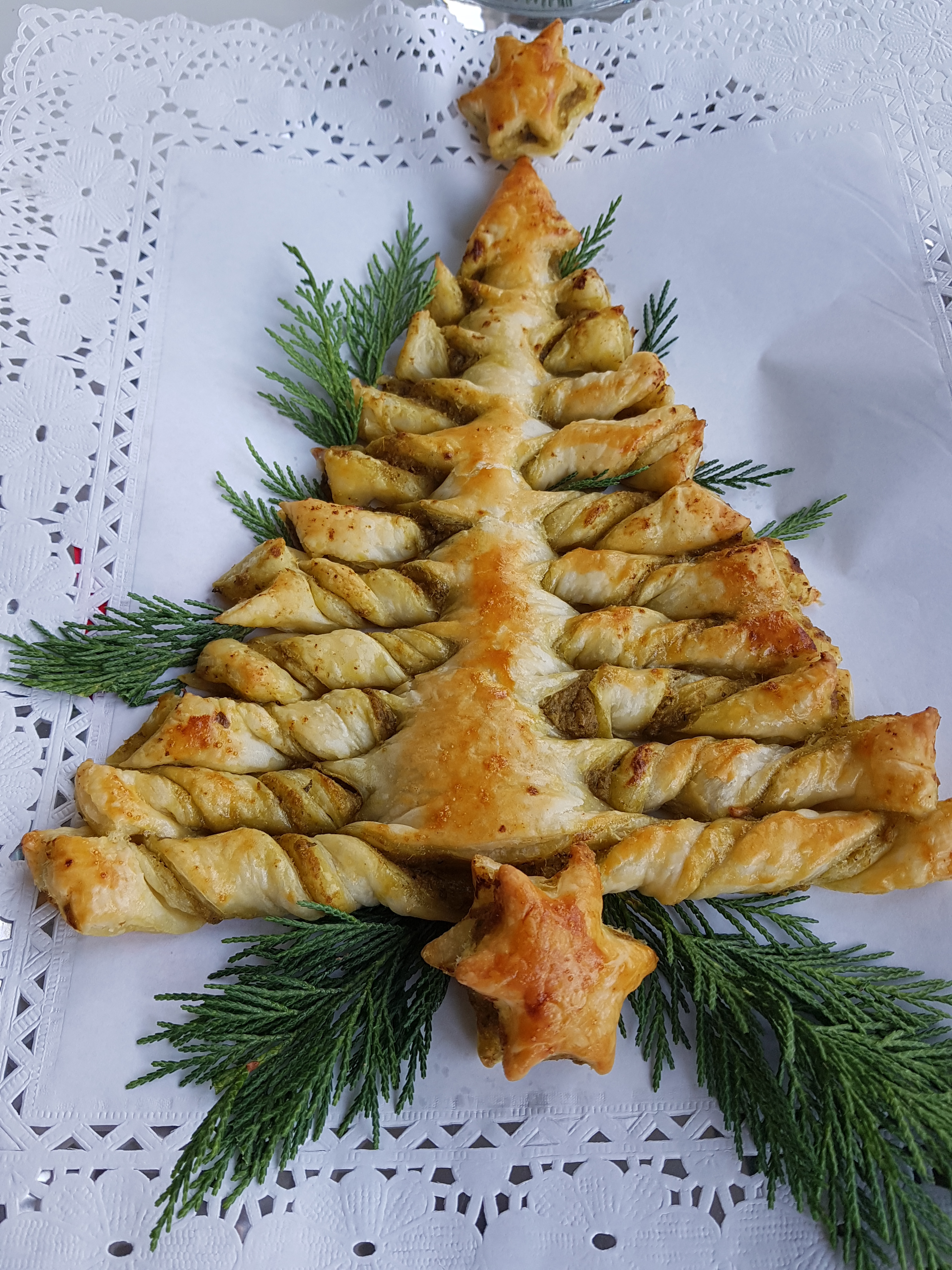 Árbol de Navidad de hojaldre relleno de salsa pesto.