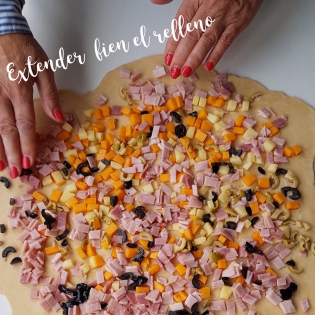 8.- Ponga el relleno-extiéndalo bien- y enrollar por la parte más ancha. Apriete un poco el relleno, se extiende mejor con las manos.