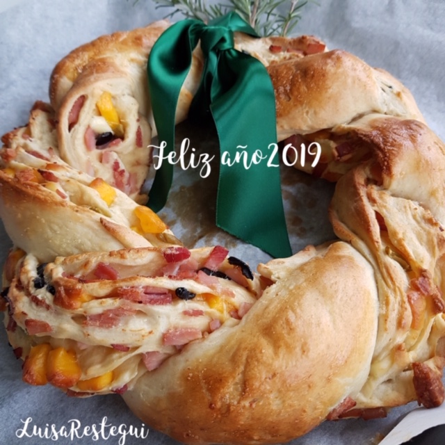 Vamos a hacer un Kringle salado. He quitado todo lo dulce del kringle y añadido a la masa queso parmesano y al relleno he puesto queso, aceitunas verdes y negras y jamón partido en cuadraditos.