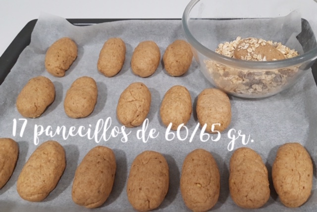 3.- Poner el muesli en un plato hondo. Con la masa se van haciendo porciones de unos 60 gr. (salen unos 16 panecillos) se hacen bolas y luego se estiran un poco para dejarlos como un panecillo. Se pincela cada panecillo con agua y se rebozan en el muesli. En una bandeja de horno se pone un papel de hornear y se ponen los bollitos.
