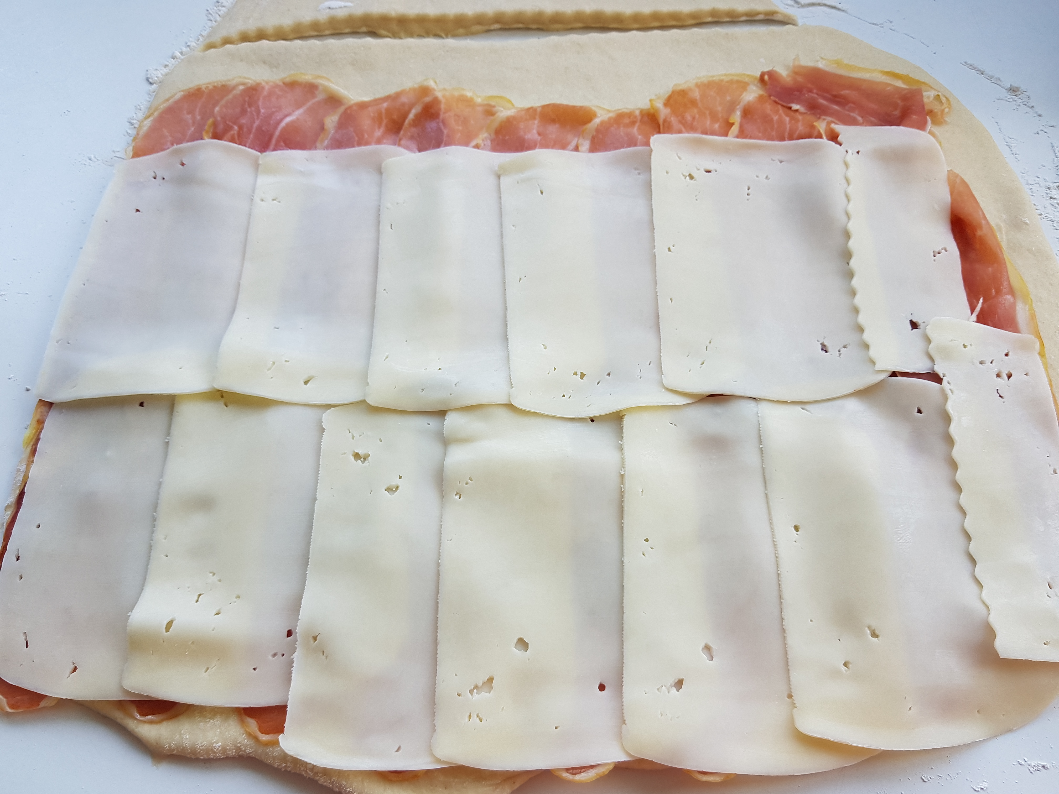 4.-Con un rodillo, extender la masa dándole forma rectangular (aprox. 30x40 cm). Cubrir la superficie con las lonchas de jamón serrano y de queso y repartir la mantequilla. Formar un rollo--como un brazo de gitano-- comenzando por la parte más ancha. Cortar en 8-9 rodajas y colocarlas en el molde preparado. Pincelar la superficie con huevo batido.