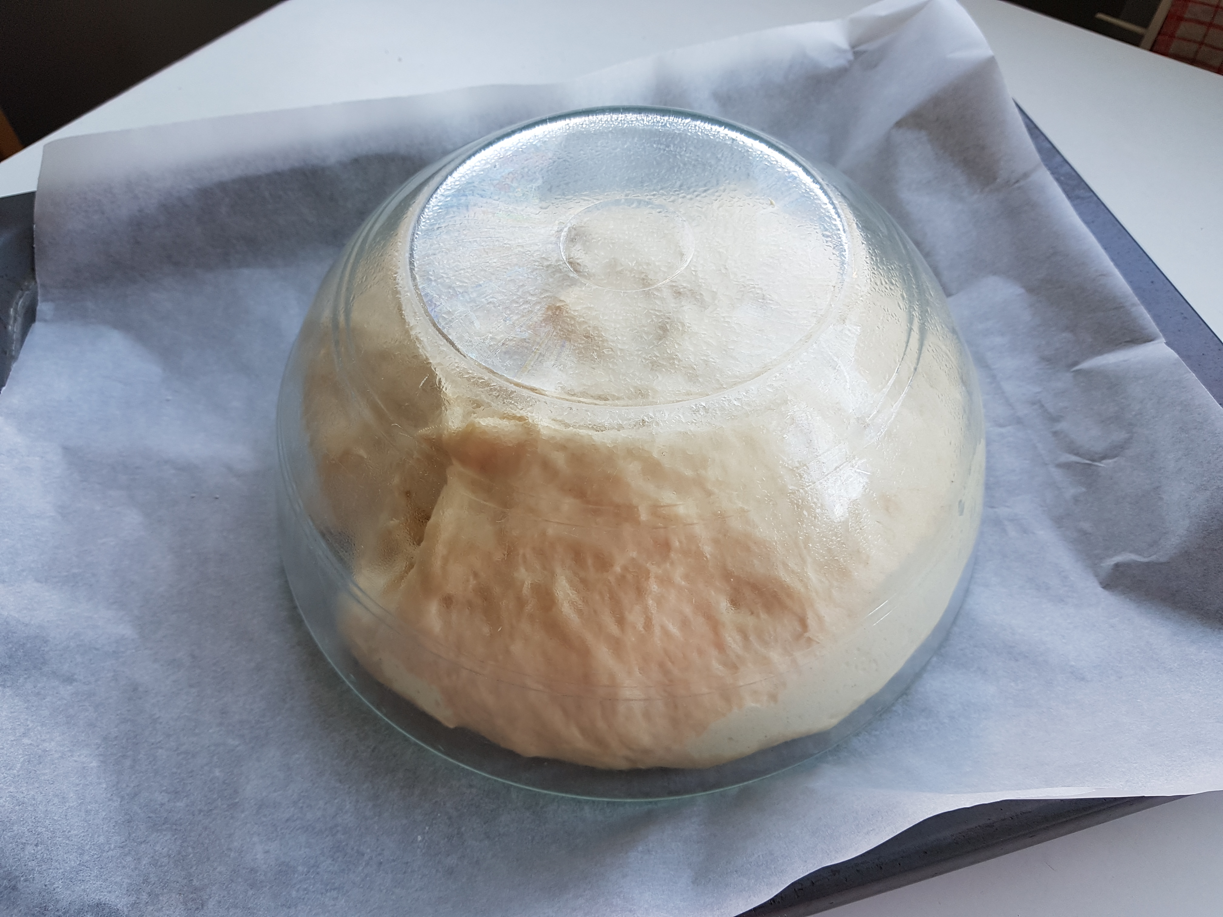 3.-Retirar la masa del vaso, formar una bola y dejar reposar en una bandeja de horno forrada con papel de hornear y cubierta con un bol grande o con un paño (15-20 minutos). De esta forma, le ayudamos a levar antes.
