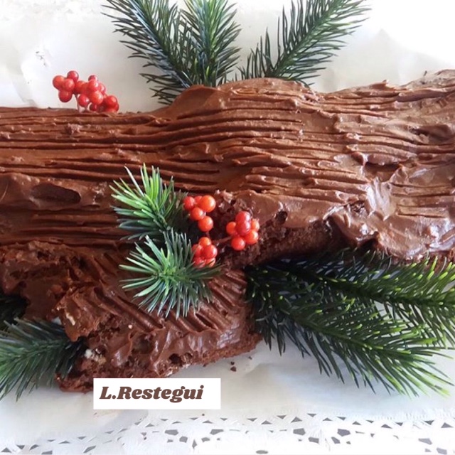 Es una receta muy, muy, muy fácil y muy lucida. Hacemos un bizcocho genovés plano, el relleno que más nos guste y por encima chocolate.