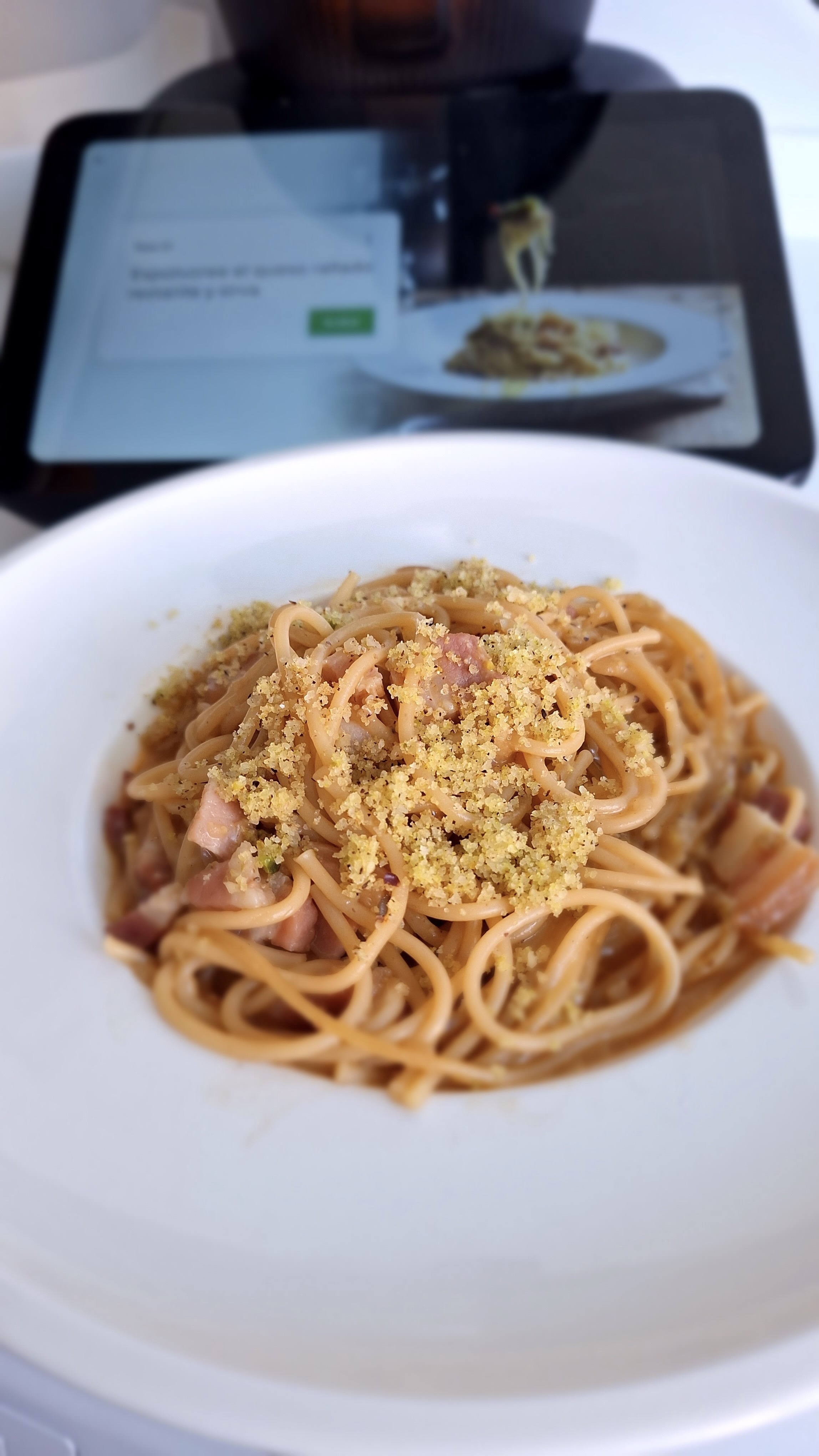 Espaguetis cremosos con queso y pistachos, es la primera receta que publico para TM7, porque tiene el nuevo Modo para cocinar sin tapa. El thermomix funcina igual que una cazuela, hasta 100º las cuchillas no se mueven. Solo lo tiene este nuevo modelo.