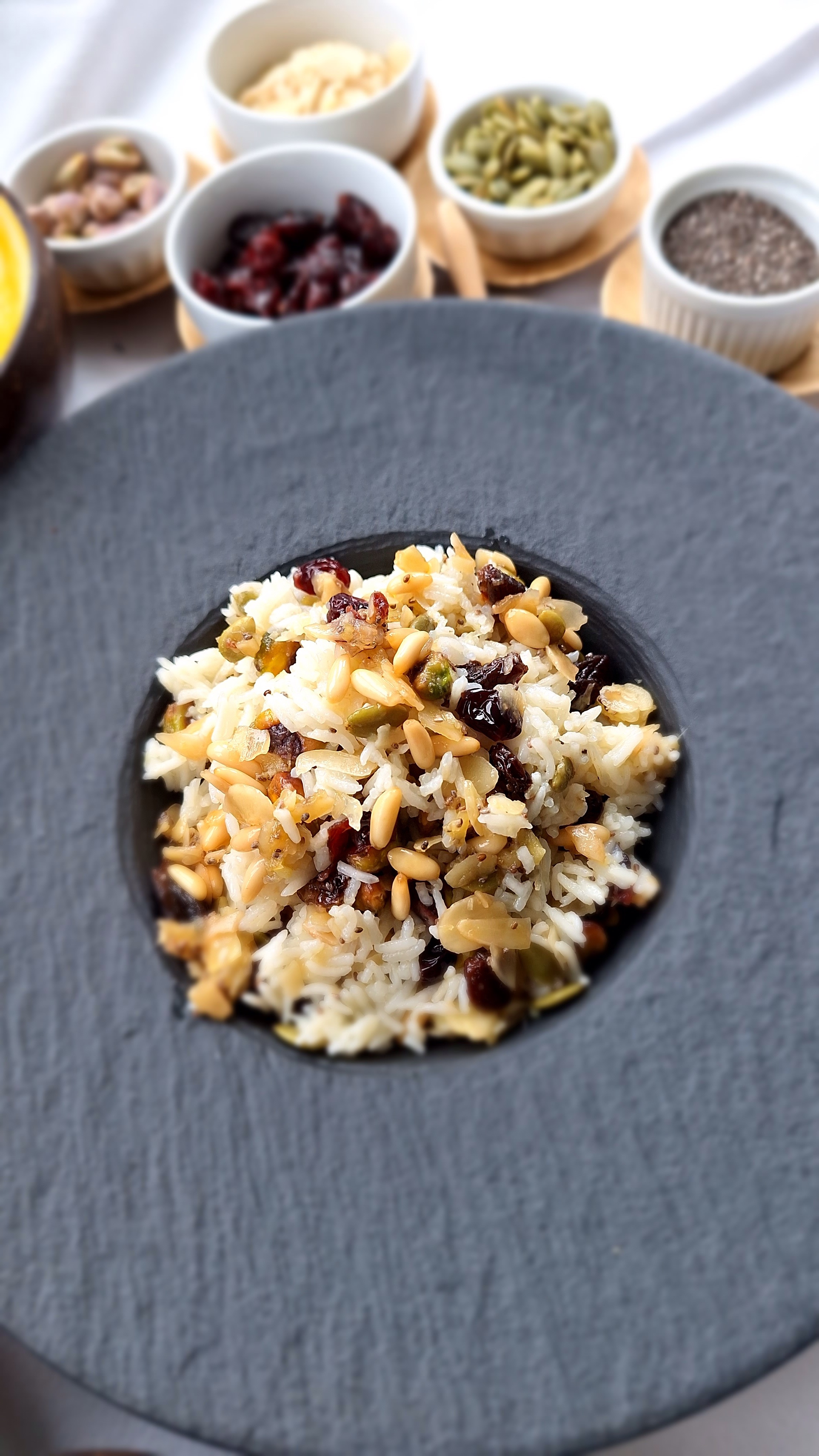 Esta receta es un plato completo que aporta proteínas, grasas saludables, fibra, antioxidantes y micronutrientes gracias a los frutos secos, las semillas y las frutas deshidratadas. Me encanta.