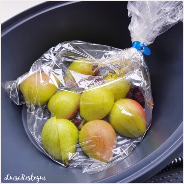 Hoy vamos a hacer en una bolsa de horno, una compota con pera, manzana y uvas pasas. Podemos hacerla con otras frutas que nos gusten, ciruelas...