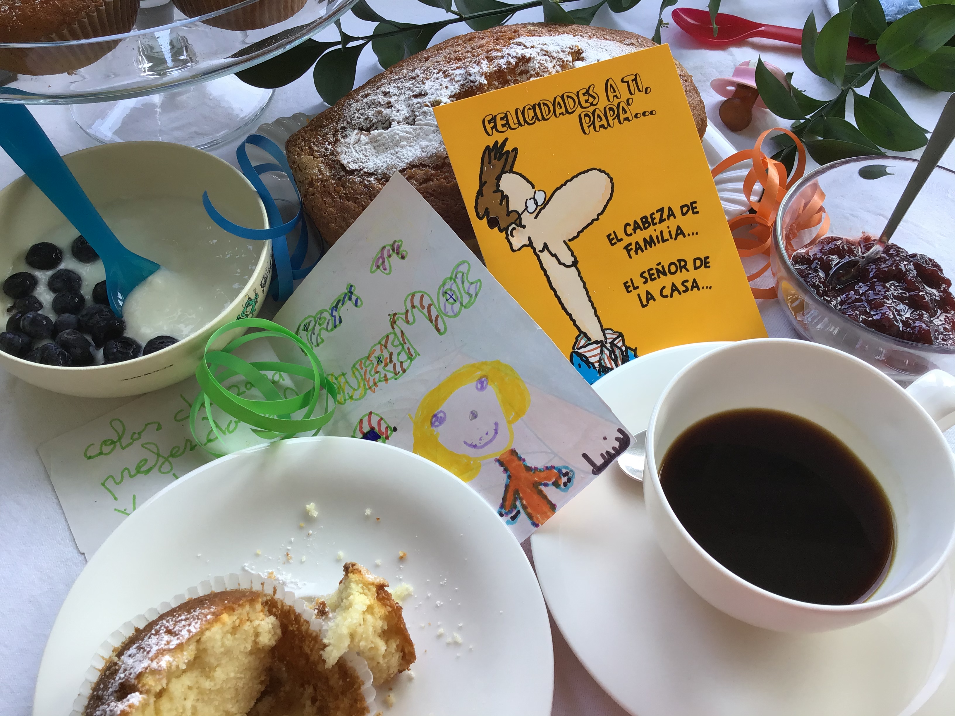 Estos días anteriores podemos ir pensando ideas para sorprenderle con un buen desayuno, ¿Qué le puede gustar? Ya lo se, desayunar todos juntos, darle los dibujos que le han hecho y la tarjeta. Un bizcocho, magdalenas, mermelada de fresa y café con leche ¡Perfecto!