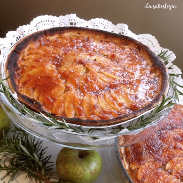 La base es de masa quebrada, encima una de compota de manzana--así sabe realmente a manzana- y decorando con las láminas de manzana y un glaseado hecho con mermelada de albaricoque o de melocotón y zumo de limón. Y al horno a gratinar un poco.