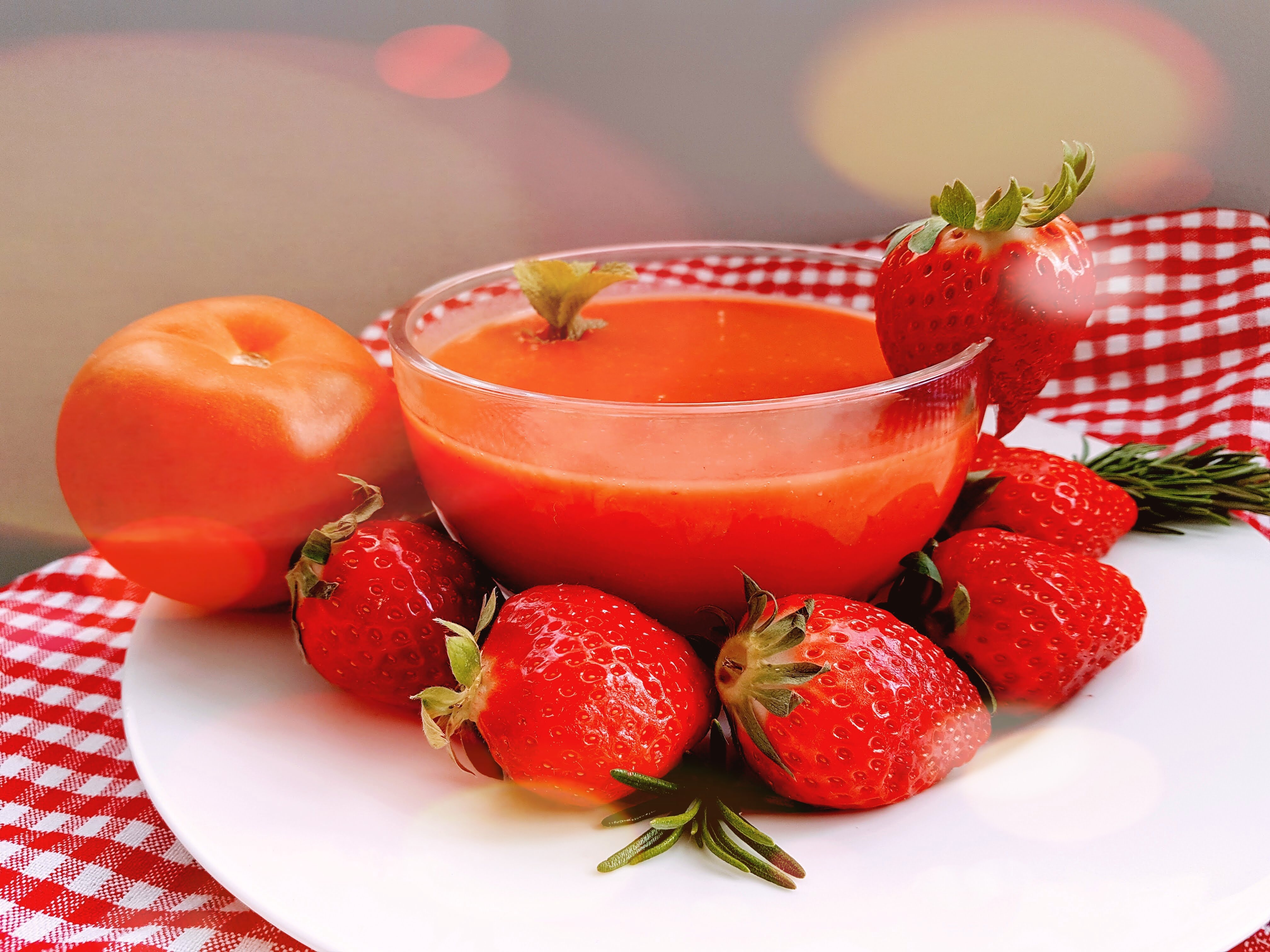 Gazpacho de fresas. Lleva la misma cantidad de fresas que de tomate. La fresa suaviza al tomate y su sabor es muy suave. Si no se dice, nadie se da cuenta.