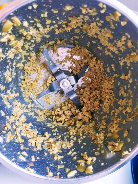 1.-Coloca las aceitunas en el vaso y programa 6 seg/ vel. 5.