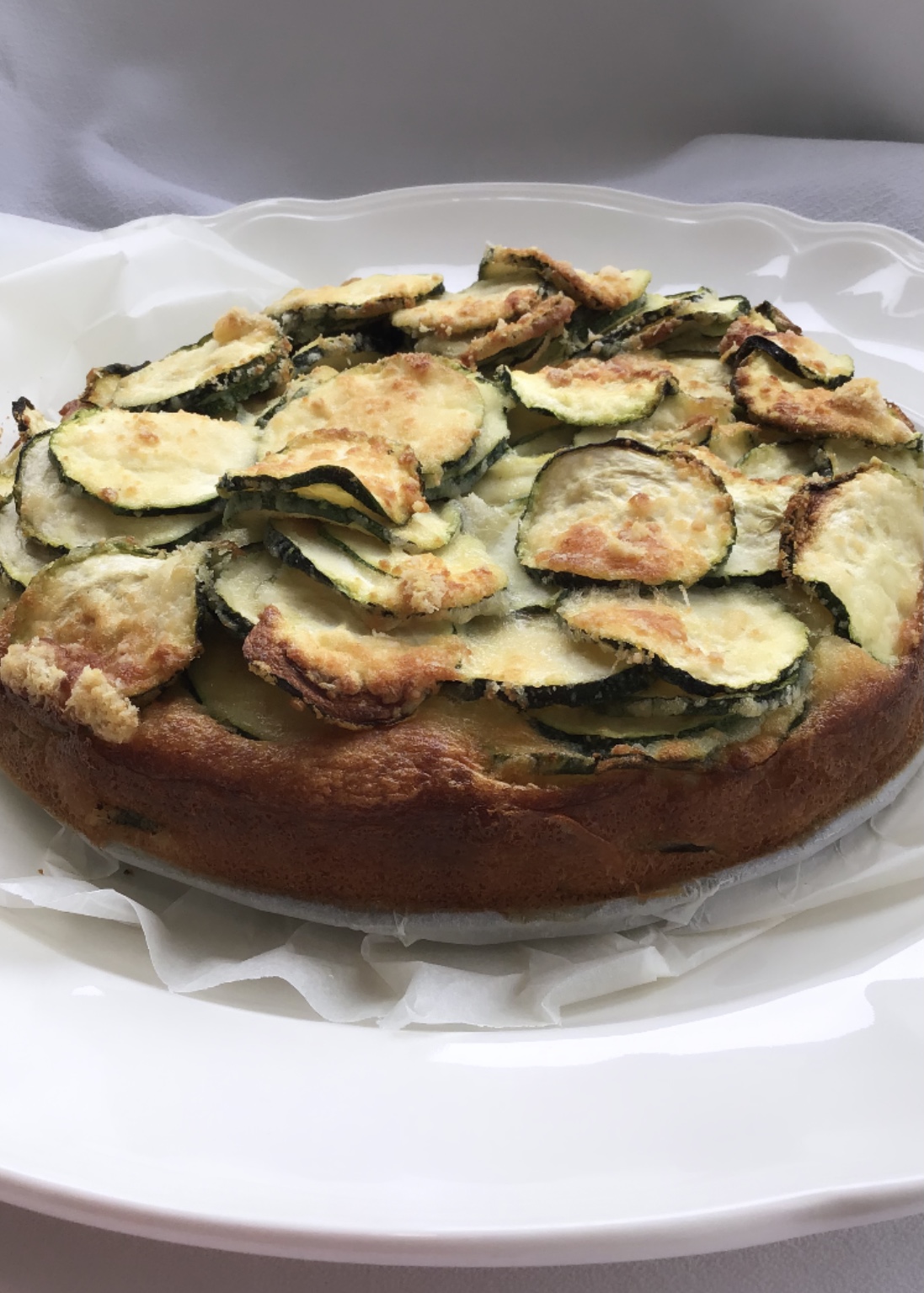 Es un bizcocho/pastel de calabacín, es una receta salada. Me gusta para un aperitivo o un picoteo tipo quiche, se parece un poco más a un bizcocho. Es muy rico y diferente. Se puede hacer con más huevos .