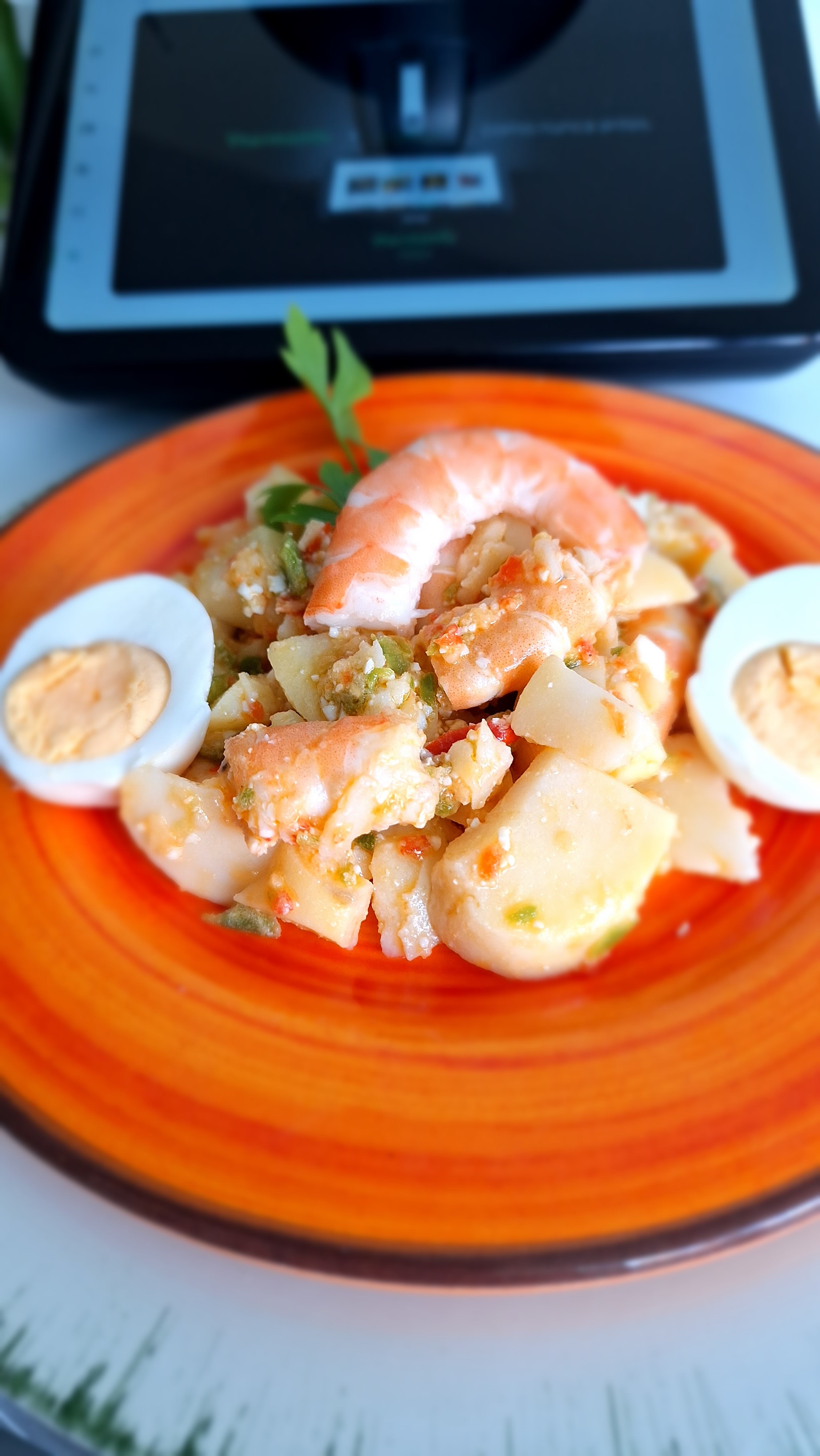 Ensalada de patatas y langostinos con salsa de vinagreta de pimientos. Inventada sobre la marcha. Me habia sobrado salsa vinagreta de unos mejillones al vapor y la he querido aprovechar. Podía haber hecho una merluza al vapor con unas patatas y acompañarla con la vinagreta. O una ensalada de legumbres con vinagreta. He hecho esto y ha quedado riquísima.