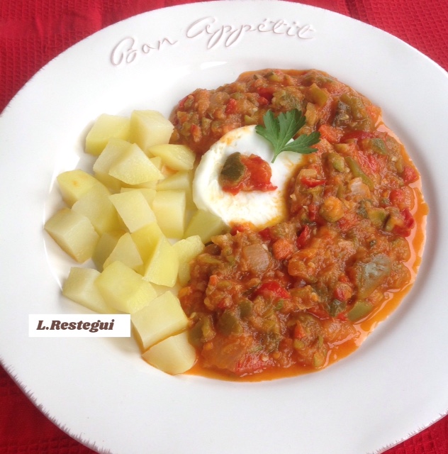 Pisto con 100 gr. de patata y huevo al vapor. Súper sano y súper rico.