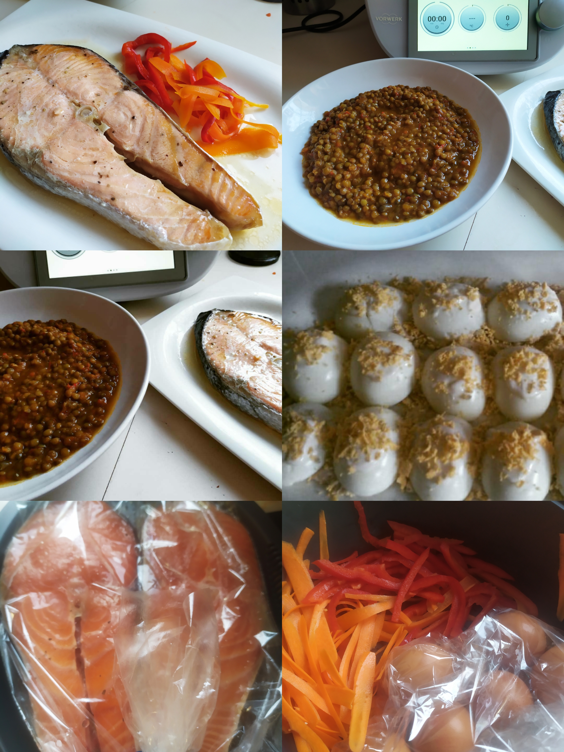 Retira el Varoma, vuelca las lentejas en una sopera. Pon el salmón acompañado de las verduras Desenvuelve, enfría, pela y corta en dos los huevos duros y rellena con atún y mayonesa. Sirve las lentejas de primer plato y el salmón de segundo y reserva los huevos rellenos para la cena.