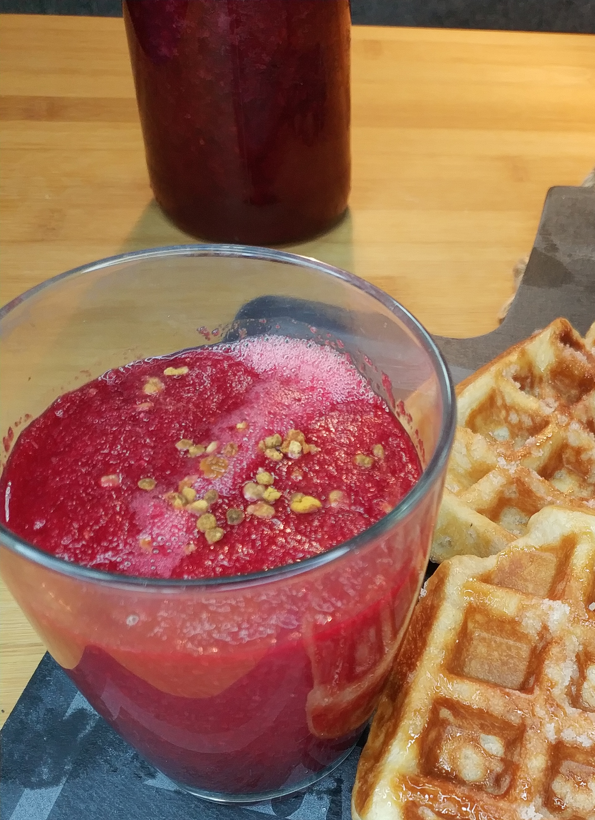 Empezar el día con un buen desayuno es importante, te propongo un zumo de remolacha con polen y unos gofres con mermelada.