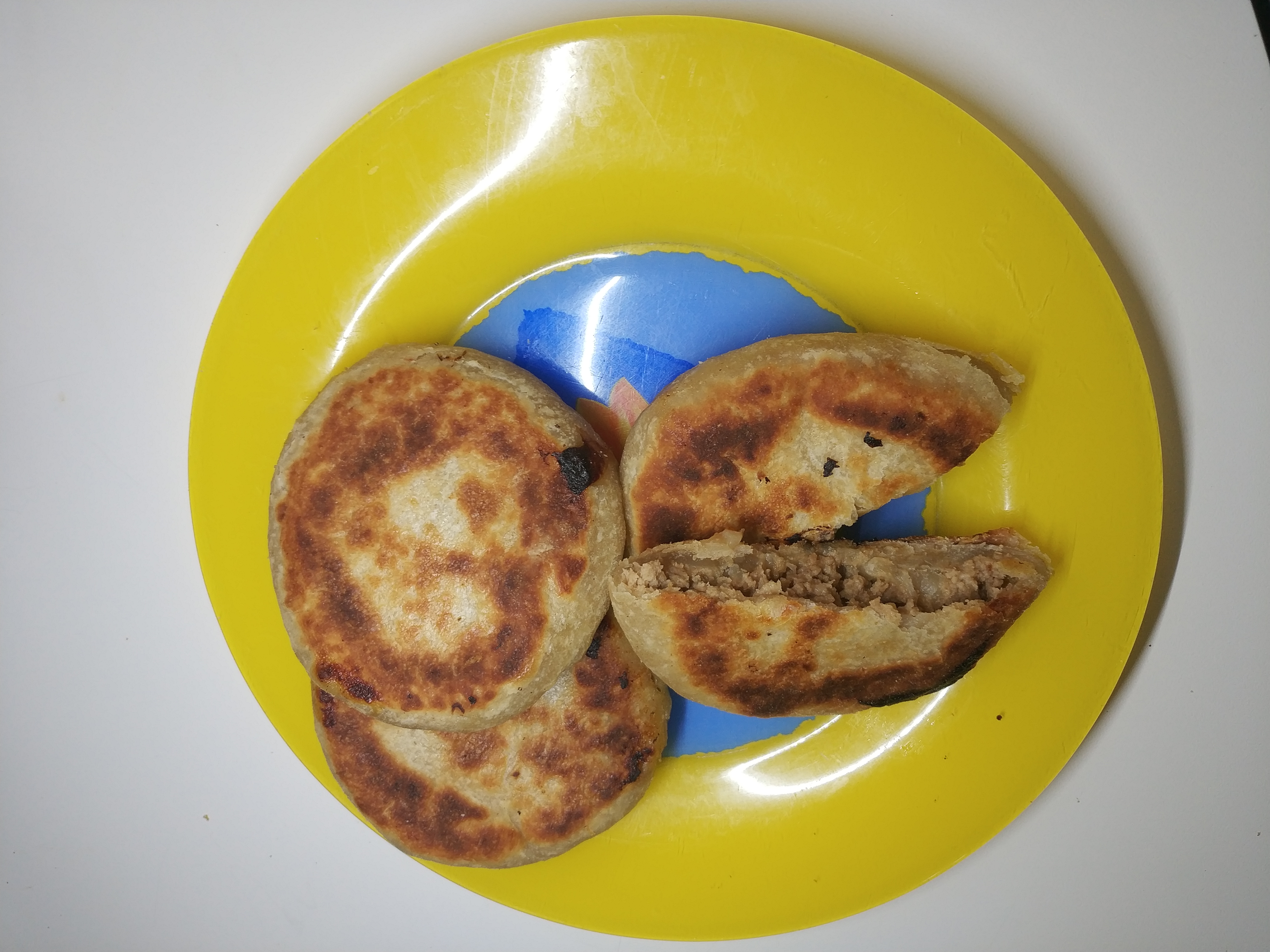 7. En una sartén con un chorrito de aceite cocinamos los Xian bing 3-4 minutos por cada lado a fuego medio bajo y tapado.
