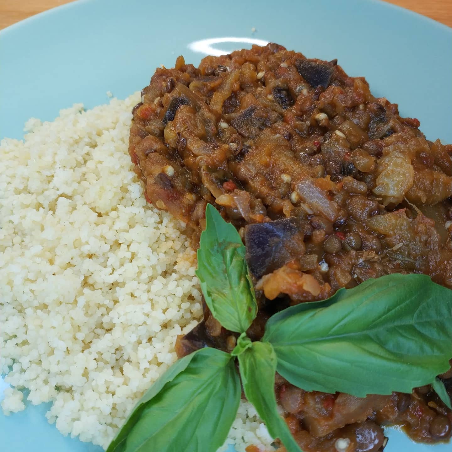 8. Coloque el cuscus en una badenes y encima ponga el guiso de berenjena. Decorar con hojas de albahaca.