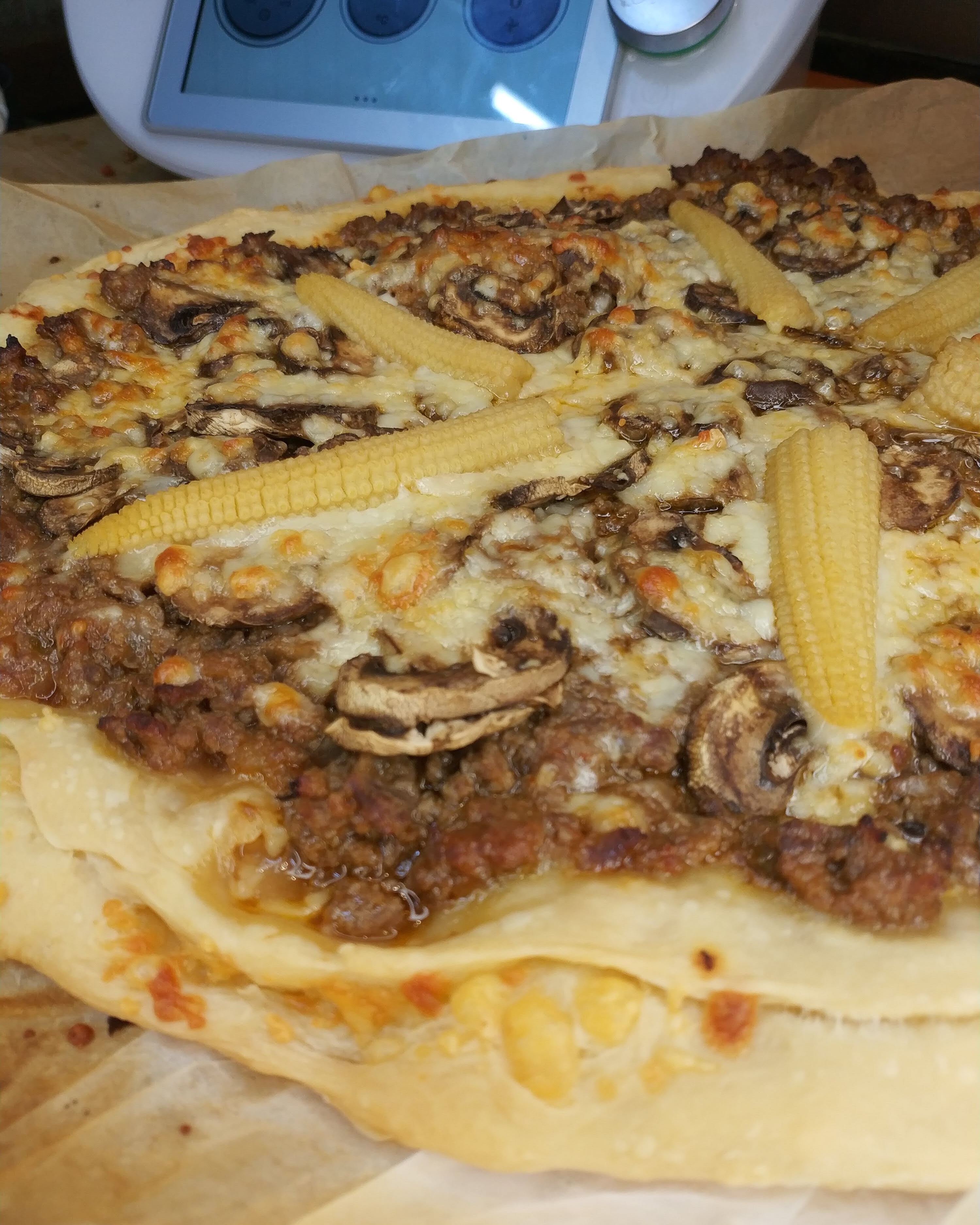 10. Con el rodillo, extienda la porción de masa más pequeña formando un circulo más pequeño y cubra con el circulo de masa el queso rallado. Reparta la carne reservada por la superficie y espolvoree con la mezcla de queso rallado, champiñones y las mazorcas dividida en dos.