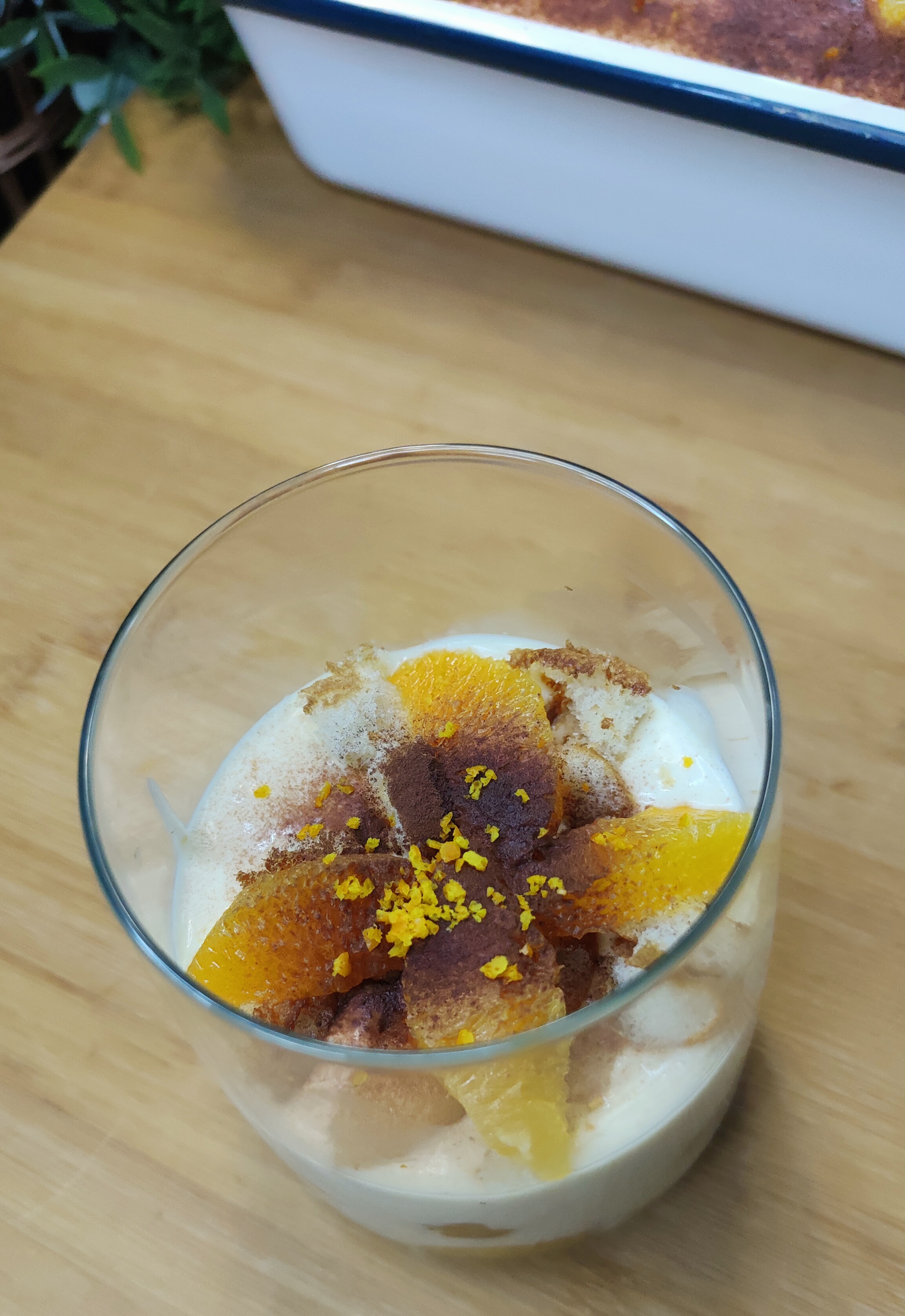 11. Como me ha sobrado un poco de crema de mascarpone, en un vaso creo capas con trocitos de bizcocho de soletilla y crema. Terminando con unos gajos de naranja.