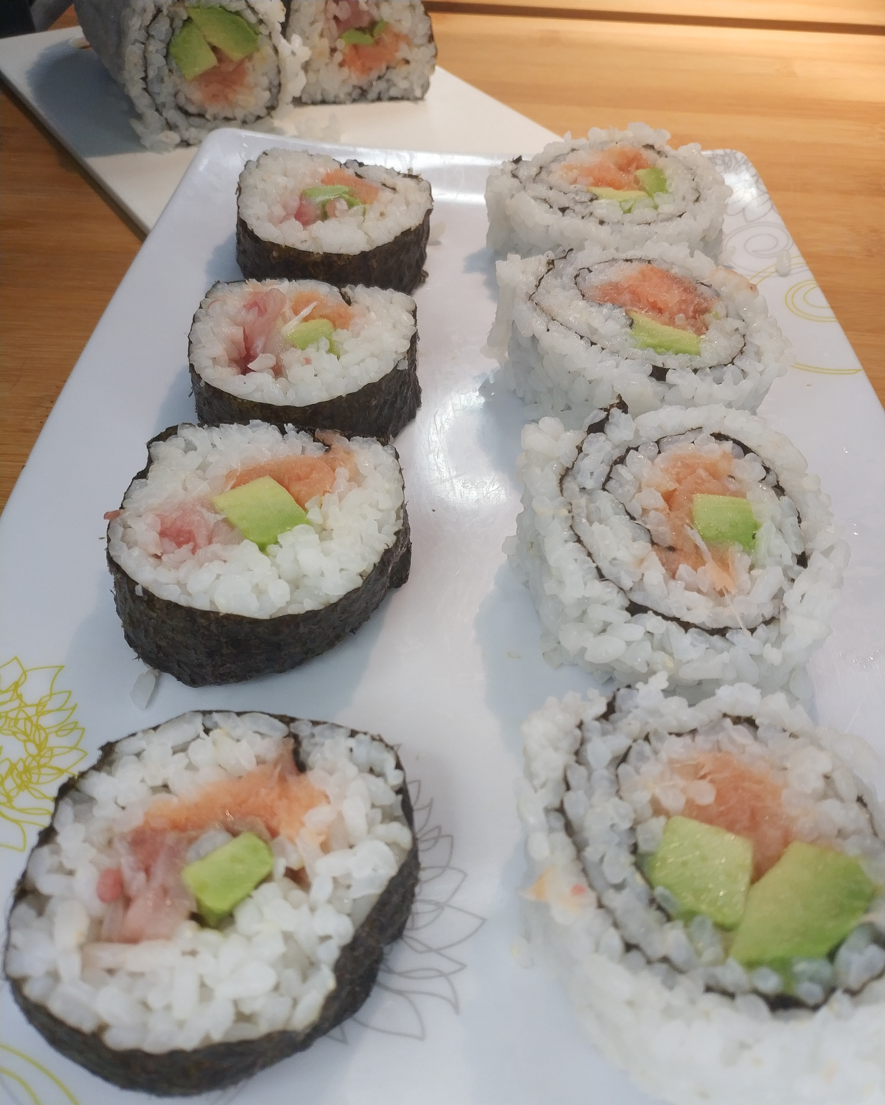 4. Con ayuda de la esterilla, enrolle el alga de modo que el relleno quede en el centro, a la vez que presiona suavemente para que quede compacto. Moje el borde final con agua para que quede sellado. Repita el procedimiento con el resto de ingredientes pero esta vez poner primero el arroz y encima el alga. Cubra con el resto del arroz y coloque el salmón aguacate y salmón, enrolle con ayuda de la esterilla. Con un cuchillo mojado en agua, corte los rollos en trozos de 2-2½ cm. Repita el proceso hasta terminar con los ingredientes, colóquelos en una bandeja.