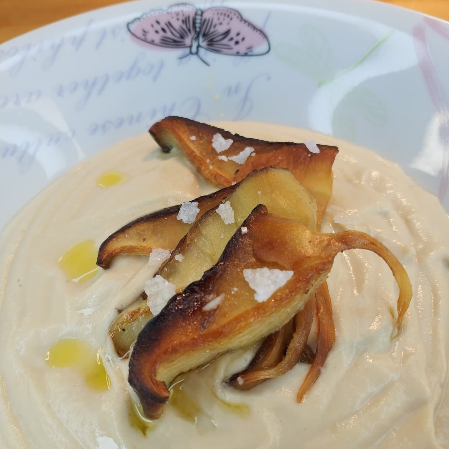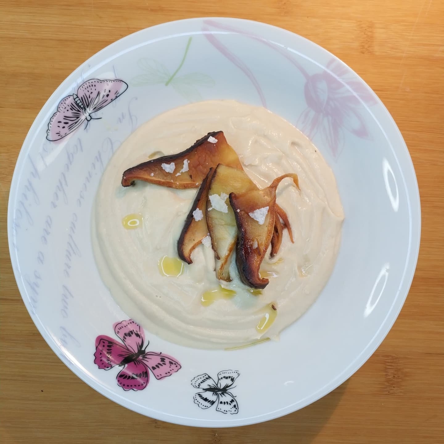6. Reparta el puré de coliflor tostada en 4 platos, coloque encima las setas shiitake, unas escamas de sal y unas gotas de aove.