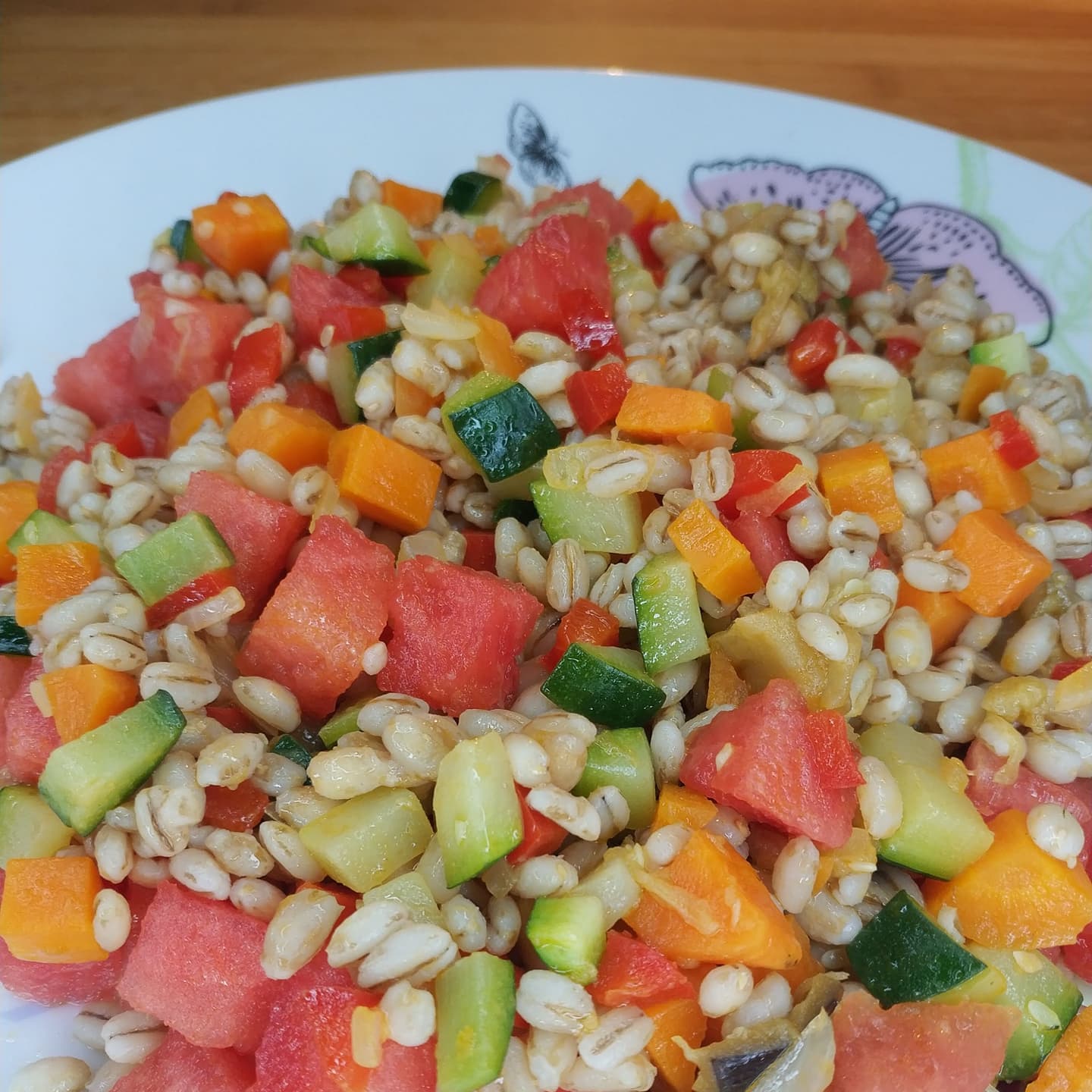 4. Añada la zanahoria, el pimiento rojo, el calabacín, la berenjena y 1 cucharadita de sal y, sin poner el cubilete, sofría 10 min/120°C/giro inverso/vel cuchara. Retire las verduras a la ensaladera y mezcle con la espátula. Añada la sandía en trocitos y sirva