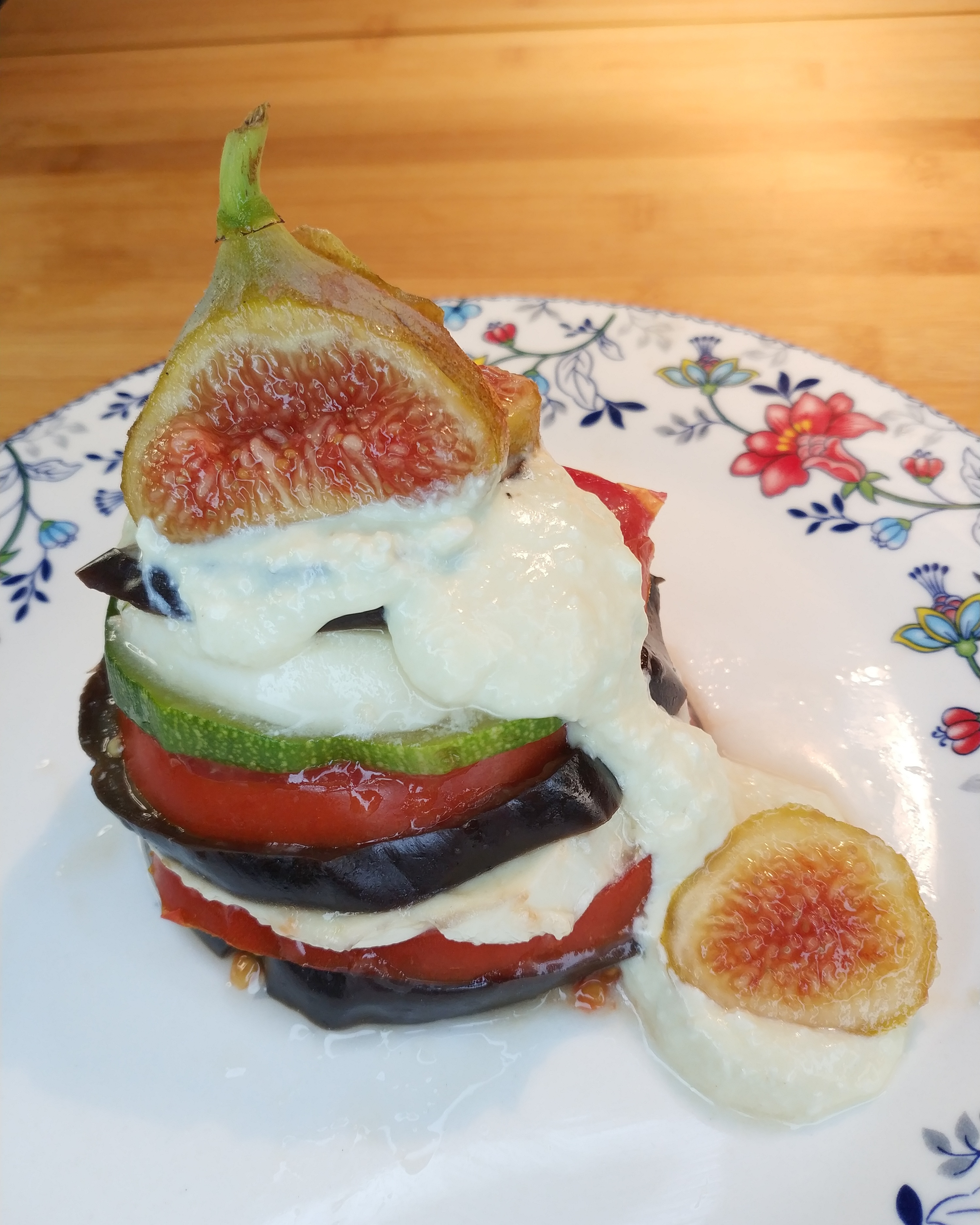 2. Corte la mozzarella en rodajas de aprox. 5 mm de grosor. En un plato, forme capas empezando por una rodaja de berenjena, tomate y mozzarella , berenjena, tomate mozzarella, calabacin , berenjena. Repita el proceso con el resto.